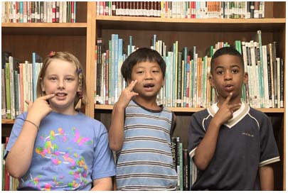 “We Cue”This entry was posted in Cued Speech Through the lens on November 20, 2003 “We Cue” Ann, Tommy, and Andy. Picture taken at Canterbury Woods Elementary for the National Cued Speech Association. All three kids have cochlear implants.